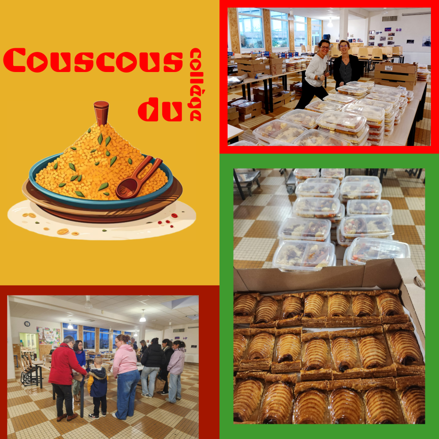 Le vendredi 8 novembre, le collège a organisé sa traditionnelle soirée couscous. Cette année, les parts ont été préparées en format « à emporter », et l’équipe enseignante a assuré la distribution des repas.