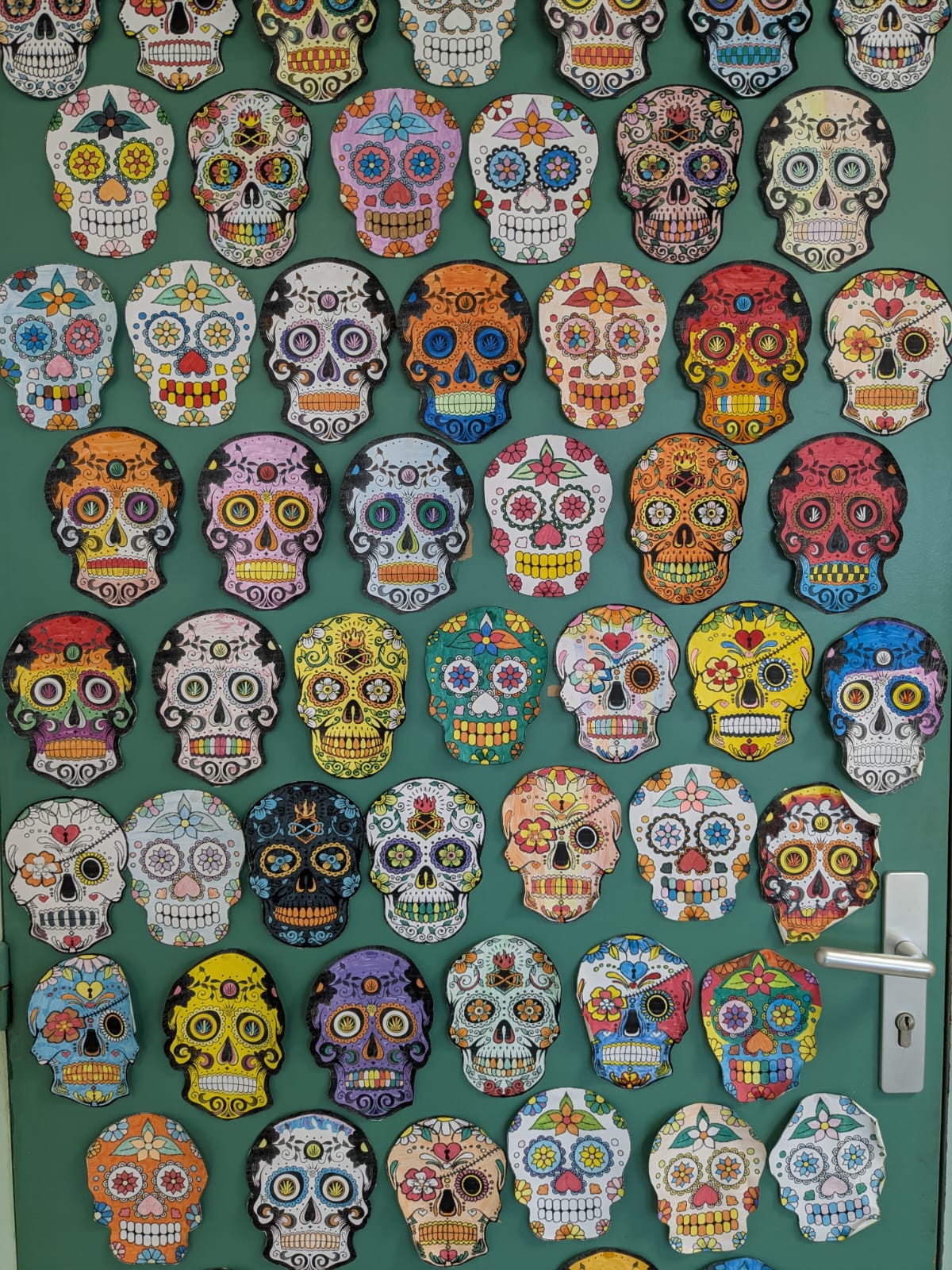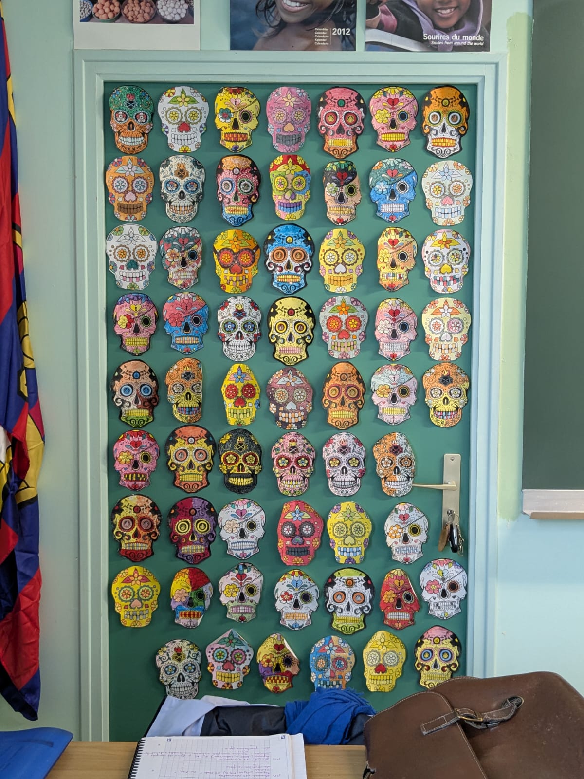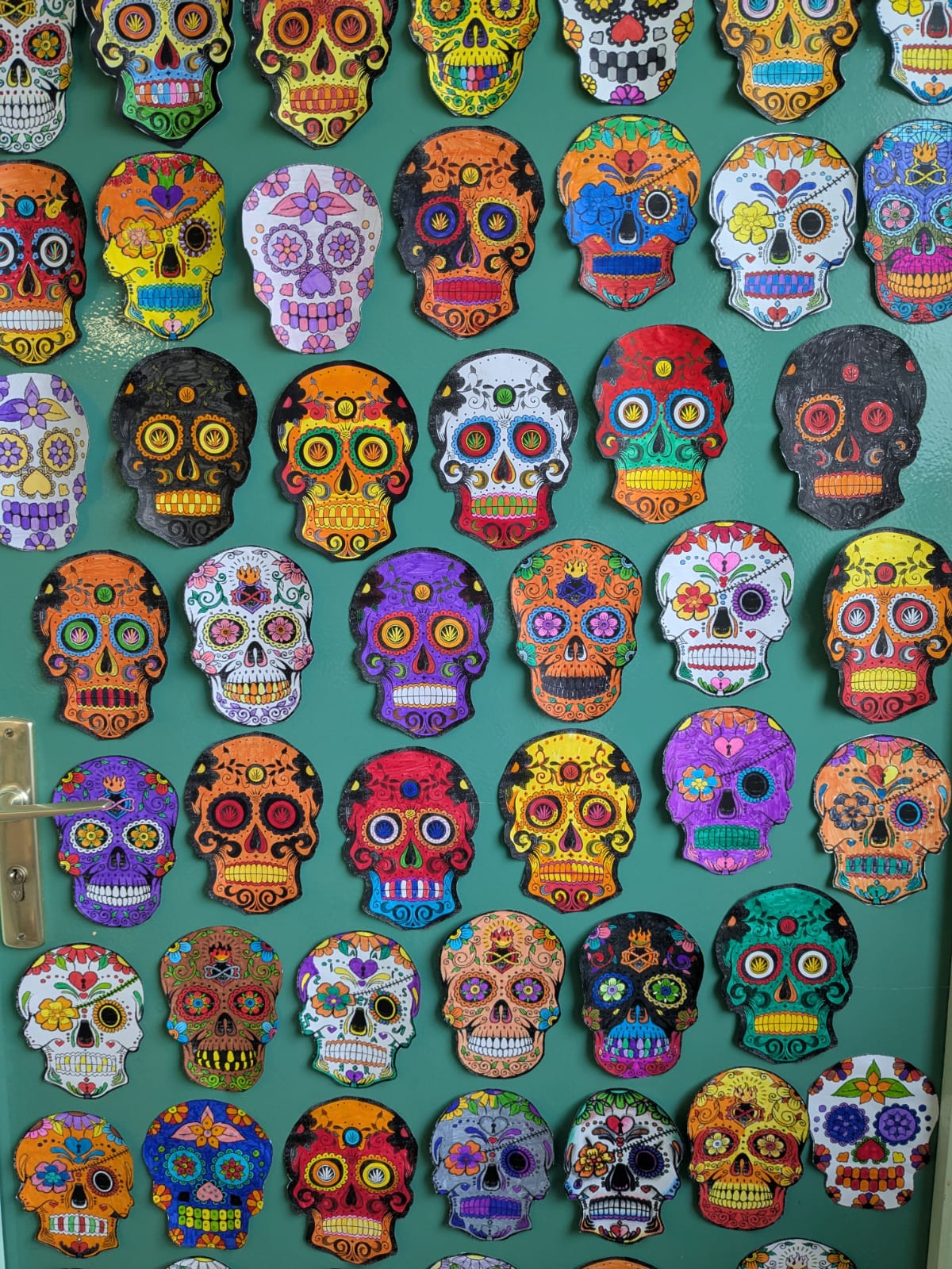 En 5e, madame Guidec a étudié, à l’occasion de la Toussaint, la fête des Morts au Mexique. Cette tradition propre à la civilisation hispanique repose sur l’adage selon lequel on rend plus hommage aux défunts en se les remémorant vivants qu’en étant tristes à l’idée qu’ils ne sont plus. Cela se traduit par l’usage de ces représentations colorées et joyeuses étudiées par nos élèves. En classe, ils ont travaillé à partir de modèles avec pour seule contrainte d’utiliser la couleur orange, qui rappelle les fleurs de Cempasuchil, qui décorent abondamment les cimetières. Pour le reste, une seule consigne : place à la joie ! Une belle passerelle interdisciplinaire entre langues vivantes et arts !